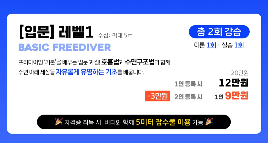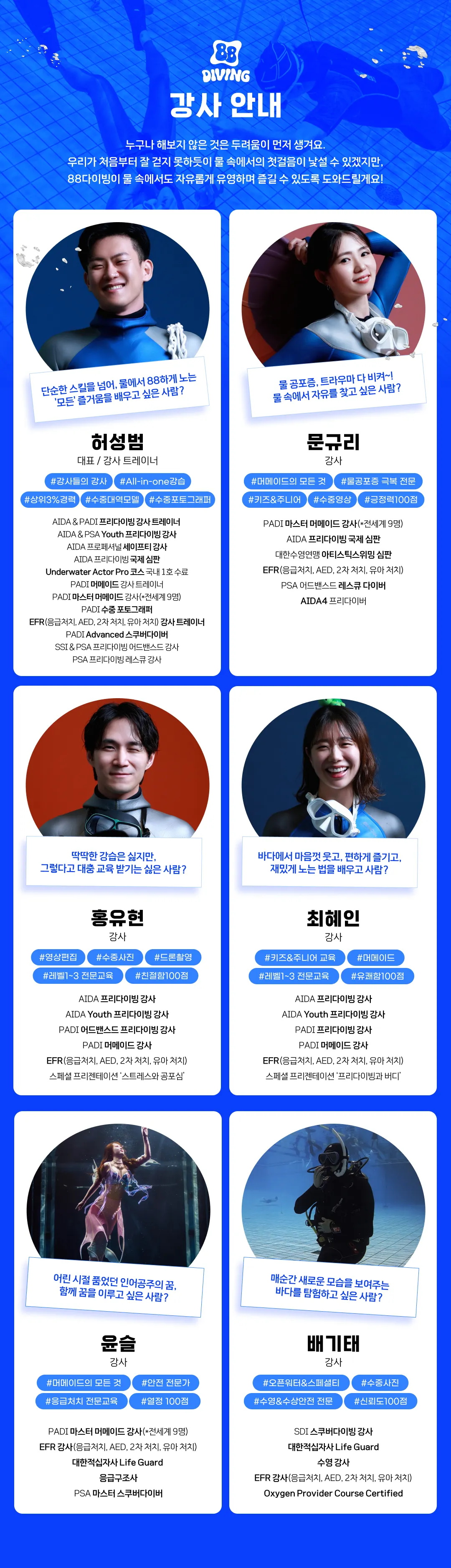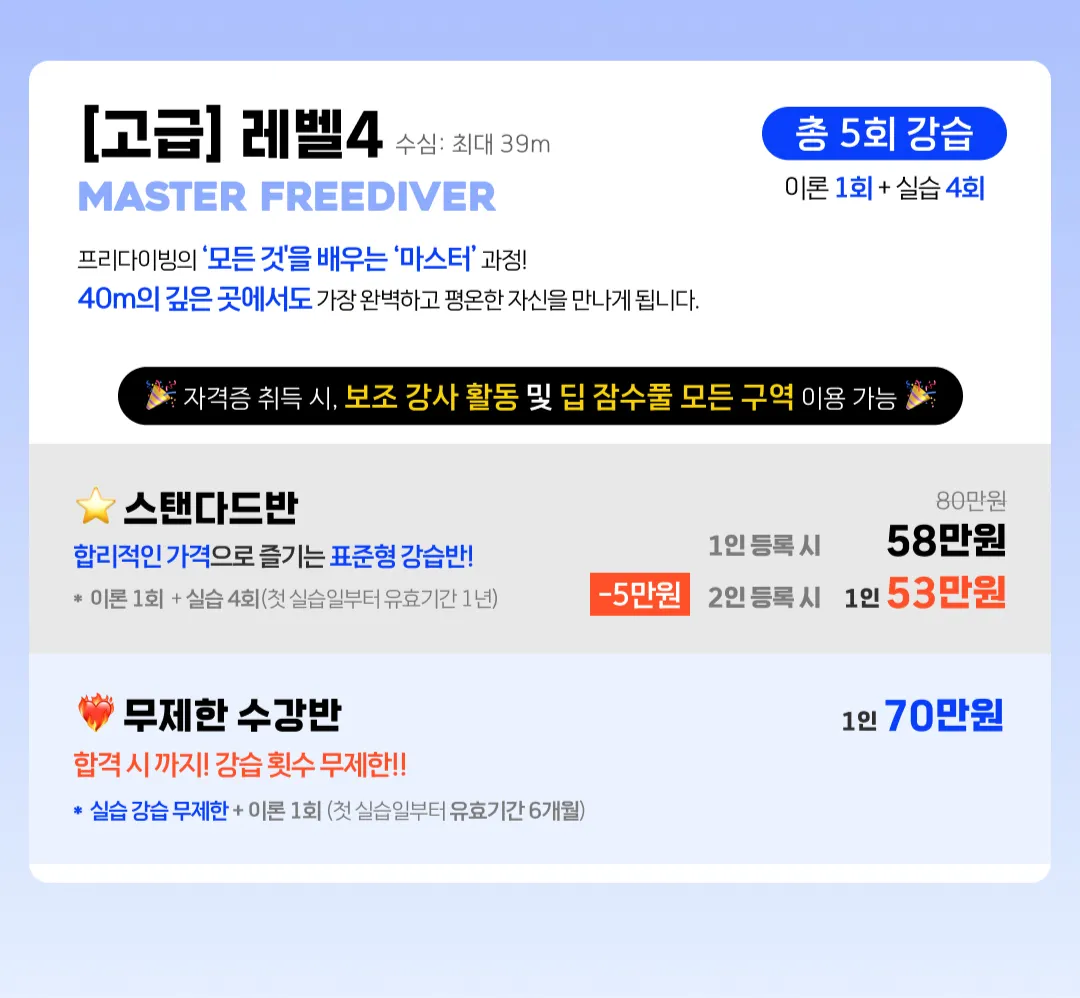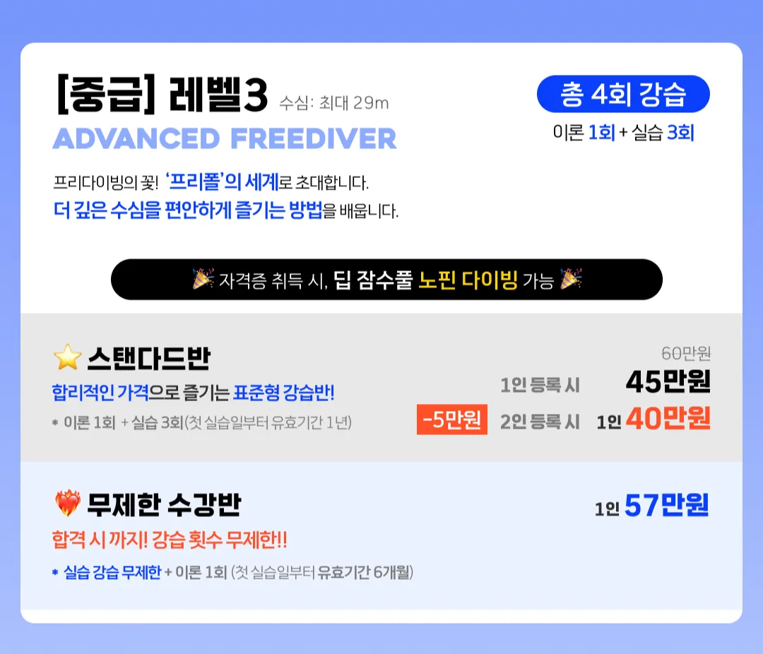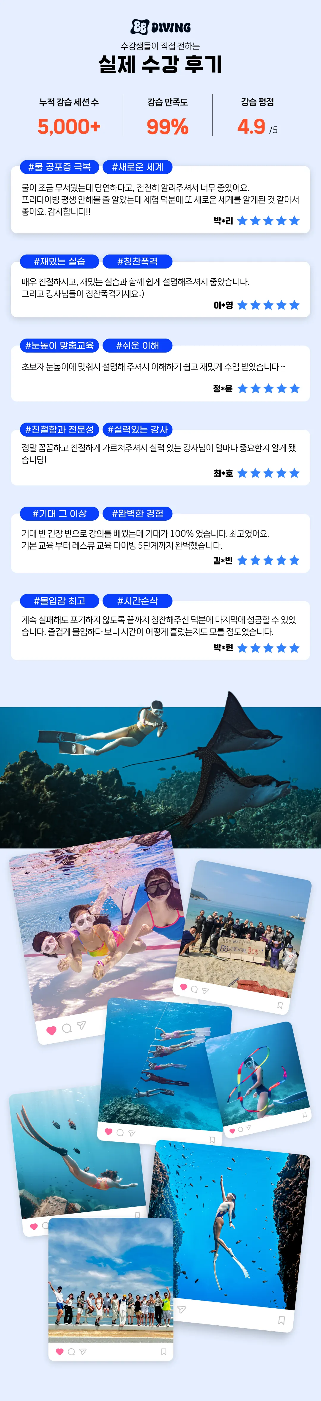 프리다이빙 & 머메이드 강사 과정 및 EFR은 별도 문의주세요.