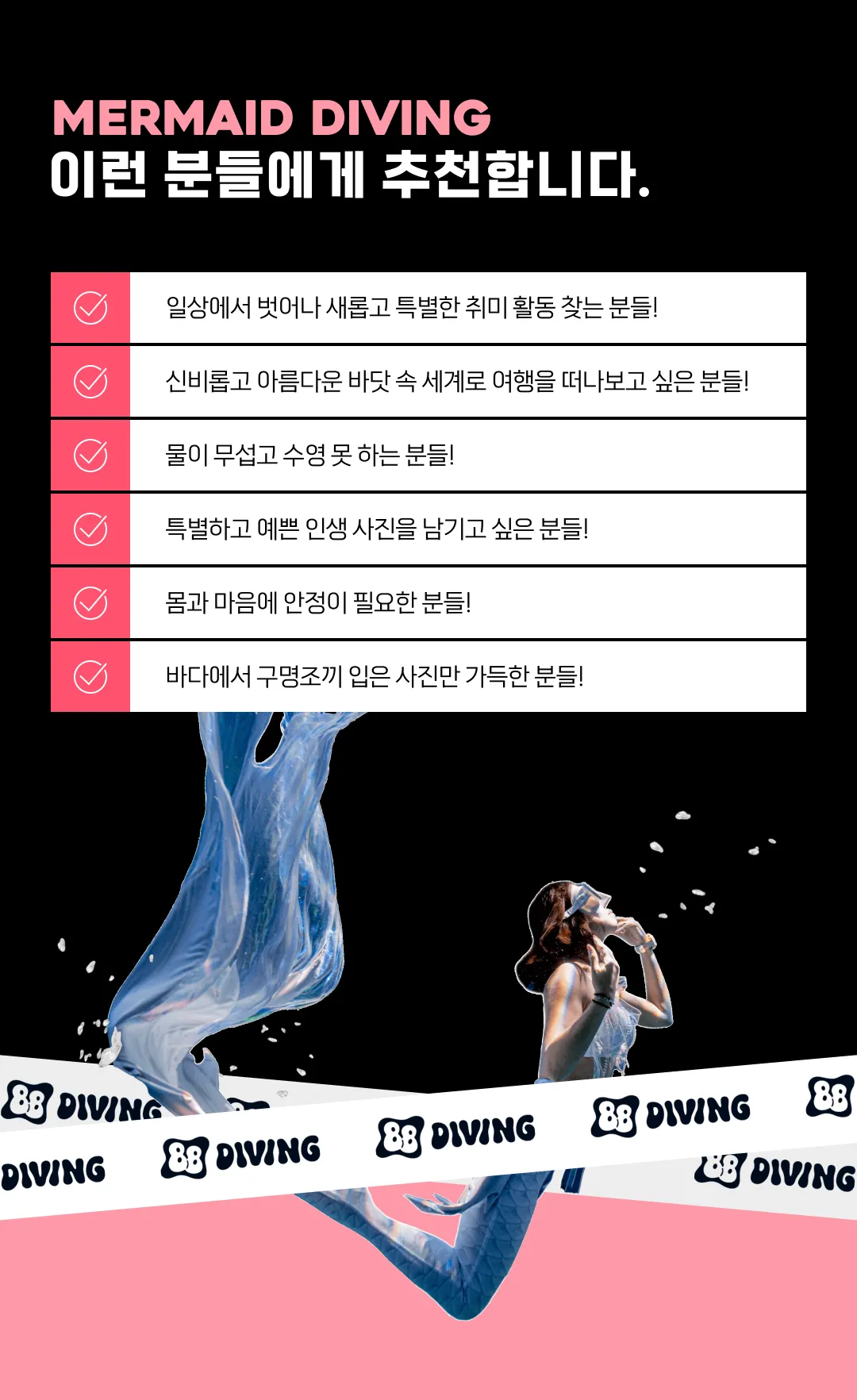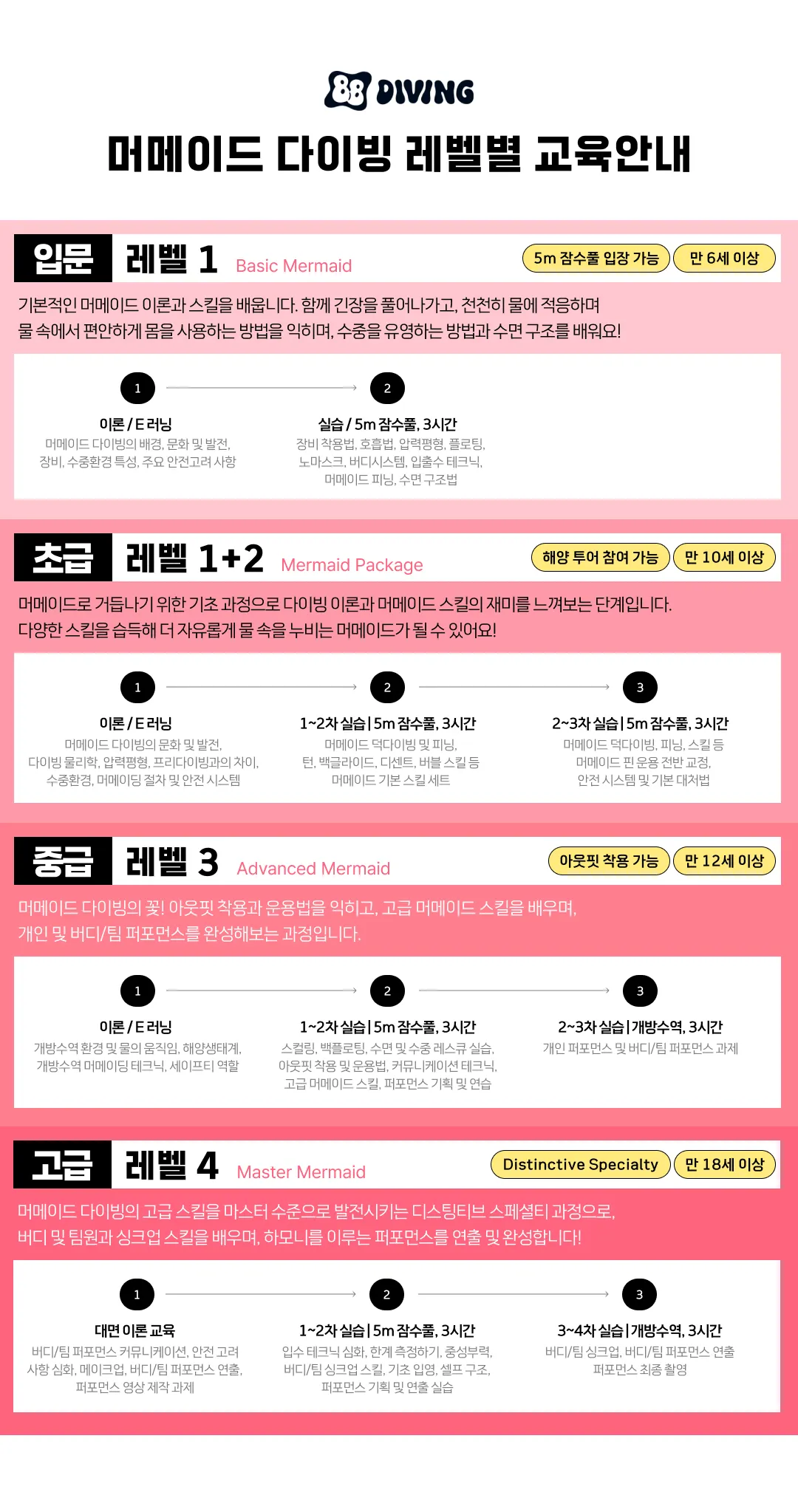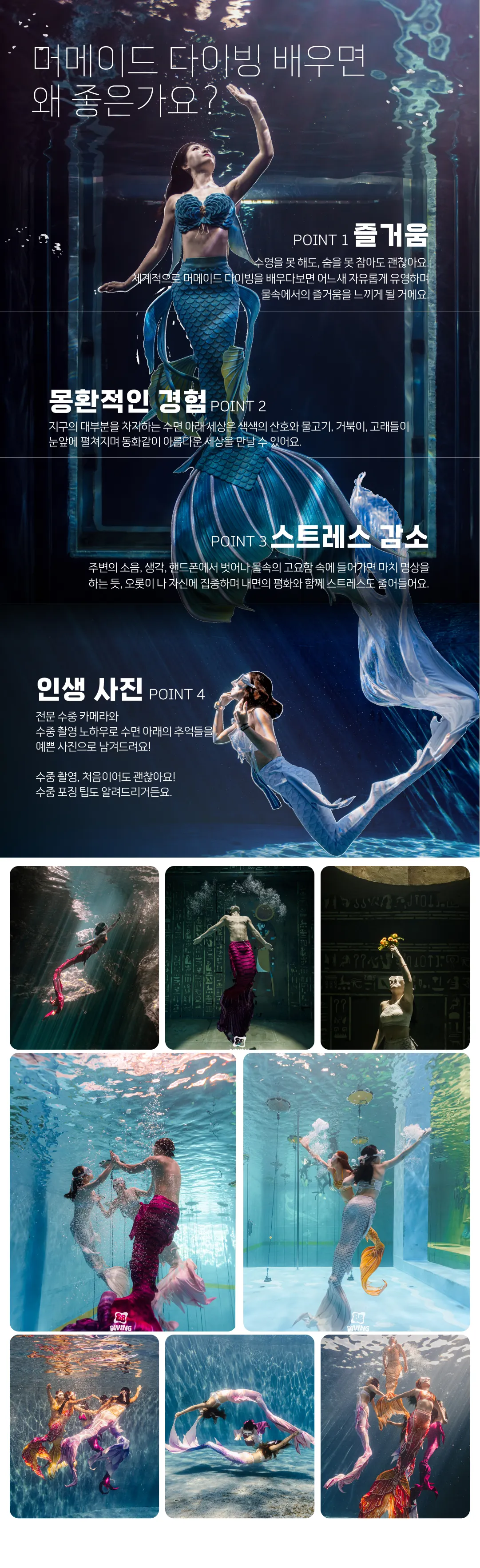 수면 아래에서의 우아한 인어의 움직임을 배우며 즐겁고 독특한 수중 경험을 쌓게 돼요. 즐겁게 놀면서 수중 포징을 배우는데 도움이 돼요.